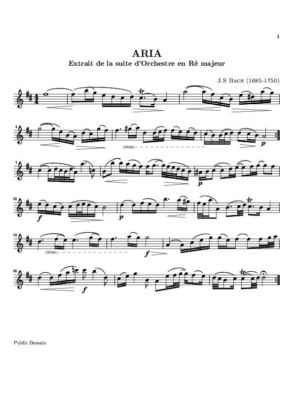 - Air on the G string, from Jean-Sebastian Bach: Postscript, PDF, PNG, lilypond source. Nathalie did the transcription.